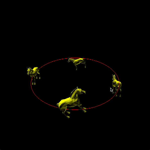 Finally, I animated its x and z position using sin and cos functions with a radius of two, which made the horse follow the circle.